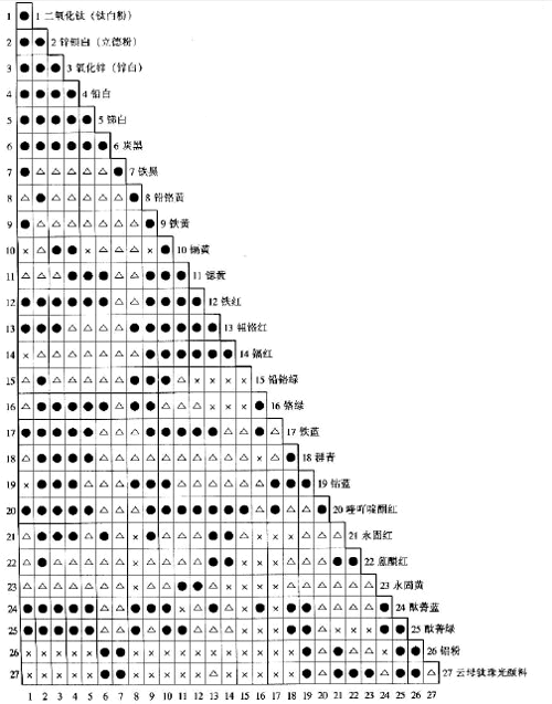 1,●代表能相互混合,即可幹拚,也可濕拚,不發生化學反應;△代表能混合,但要視顏料表麵處理情部而定,能幹拚,混拚時可能發生不良反應;×代表不能混合,即不能幹拚也不能濕拚.否則會發生褪色、顏色遷移、色相互補使亮度降低或有危險.