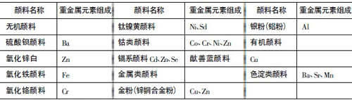 含有鉛、鉻等化合物的無機顏料一般認為是有毒顏料,世界各國均製定廠相應的法規,嚴禁用其著色的塗料塗飾與食品有關的容器、玩具等物件.幾種常用顏料含重金屬元素及其組成列於下表.一些汽車塗料對塗料中重金屬含量有嚴格規定。