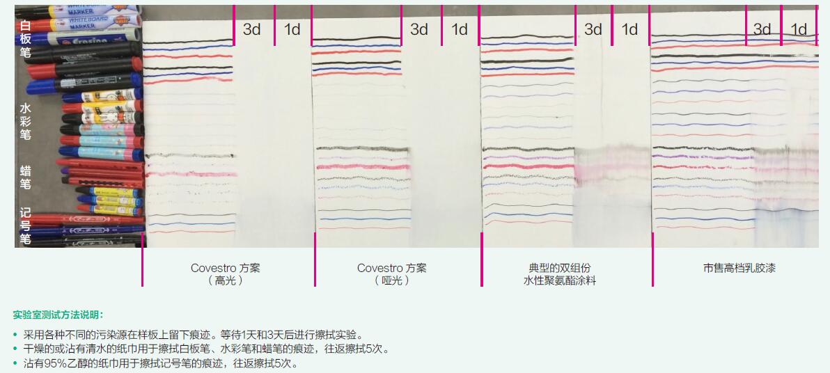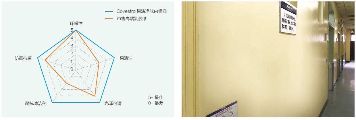 相比於市售高端的內牆乳膠漆,科思創的雙組分水性聚氨酯解決方案在保持優異的環保性和裝飾性的同時,在易清潔性、耐抗清潔劑、防黴抗菌等諸多方麵呈現出卓越的性能。
