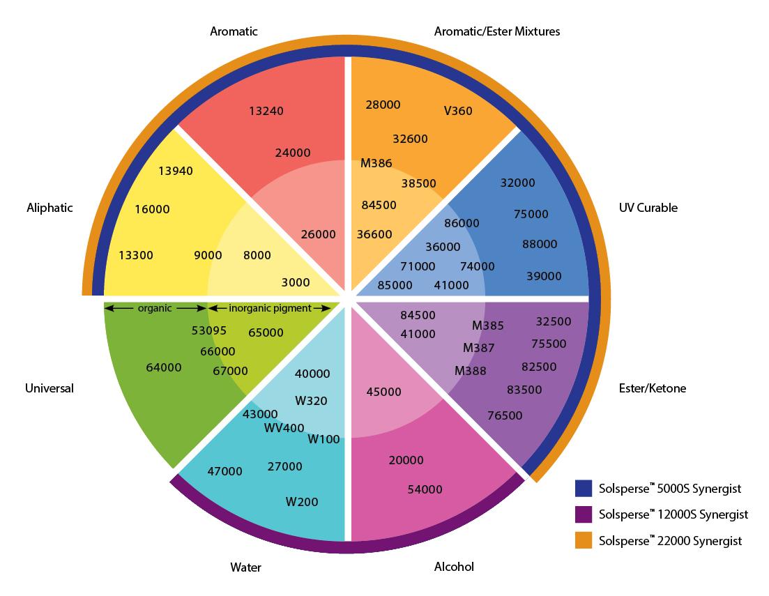 路博潤Solsperse超分散劑技術是為油漆、塗料和製版印刷配方賦予高性能所必不可少的重要成分。 該技術可幫助生產幾乎任何固體顆粒和連續相(液體或固體)組合的高濃度、高穩定性且廣泛相容的分散體。 該分散劑技術可結合因其在特定溶劑及/或樹脂組合中的溶解性而選定的聚合穩定鏈和為獲得較強的顆粒表麵吸收性而優化的錨群;在此表麵內,錨群劑量將根據顆粒的表麵麵積而決定。 這項技術可用於生產具有更高固體含量、更低粘度的空間穩定分散劑,相比使用樹脂製造的分散劑或更低分子重量的分散劑或表麵活性劑,其可改善粘度和顆粒粒度穩定性。 聚合物分散劑必須能溶解在用於分散顏料或填料的溶劑中,方能真正發揮其功效。 因此,分散過程中使用的溶劑介質是選擇分散劑的主要標準。